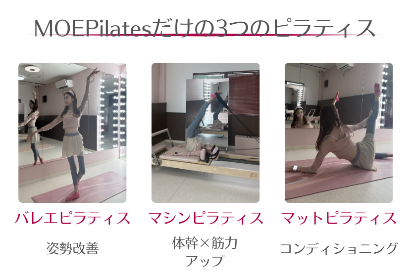 ピラティススタジオ MOEPilatesでは、ひとつのスタジオではかなわなかった3つのピラティスを同時に受けられます。
